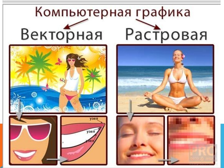 КОМПЬЮТЕРНАЯ ГРАФИКА. Первоначально результатами работы ЭВМ были только числа на бумаге. Затем появились рисунки НАУЧНАЯ ГРАФИКА Это направление появилось первым. Первые компьютеры использовались лишь для решения ДЕЛОВАЯ ГРАФИКАПлановые показатели, отчетная документация, статистические сводки и т. п. – вот КОНСТРУКТОРСКАЯ ГРАФИКАГрафика в сочетании с расчетами позволяет проводить в наглядной форме поиск ИЛЛЮСТРАТИВНАЯ ГРАФИКАПрограммные средства иллюстративной графики позволяют человеку использовать компьютер для произвольного рисования. ХУДОЖЕСТВЕННАЯ И РЕКЛАМНАЯ ГРАФИКАСоздание реалистических (близких к естественным) изображений КОМПЬЮТЕРНАЯ АНИМАЦИЯПолучение движущихся изображений называется компьютерной анимацией. «Анимация» - «оживление» («animal» - животное) Разработки в области компьютерной графики сначала двигались лишь академическим интересом и шли ВИДЫ КОМПЬЮТЕРНОЙ ГРАФИКИрастроваявекторнаяфрактальнаятрехмерная РАСТРОВЫЕ ИЗОБРАЖЕНИЯСовокупность точек (пикселей) разного цвета ПИКСЕЛЬ (pixel — picture element) — черно-белые или цветные точки, на которые Растровая графика - применяют при разработке электронных (мультимедийных) и ДОСТОИНСТВА РАСТРОВОЙ ГРАФИКИПри высокой разрешающей способности растровое изображение имеет фотографическое качество;Растровые редакторы НЕДОСТАТКИБольшой размер графических файлов (в файле хранится информация о каждой точке). Искажения, Графические редакторы:Paint, Adobe Photoshop ВЕКТОРНАЯ ГРАФИКА  это метод представления изображения в виде совокупности отрезков и ВЕКТОРНЫЕ ИЗОБРАЖЕНИЯСовокупность простых элементов: прямых линий, дуг, эллипсов, прямоугольников называют графическими примитивами. ДОСТОИНСТВАФайлы векторного типа имеют относительно небольшие размеры.При масштабировании не происходит искажения.Играют огромную ВЕКТОРНЫЕ ГРАФИЧЕСКИЕ РЕДАКТОРЫвстроенный графический редактор WordCorel Draw (универсальный инструмент для создания и редактирования векторной графики) ЦВЕТОВЫЕ МОДЕЛИмодель RGB. В этой модели работают мониторы и бытовые телевизоры. Любой ФРАКТАЛЬНАЯ ГРАФИКАФрактал - это рисунок, который состоит из подобных между собой элементов.Построение ТРЕХМЕРНАЯ ГРАФИКА Трёхмерная графика (3D-графика) изучает приёмы и методы создания объёмных моделей