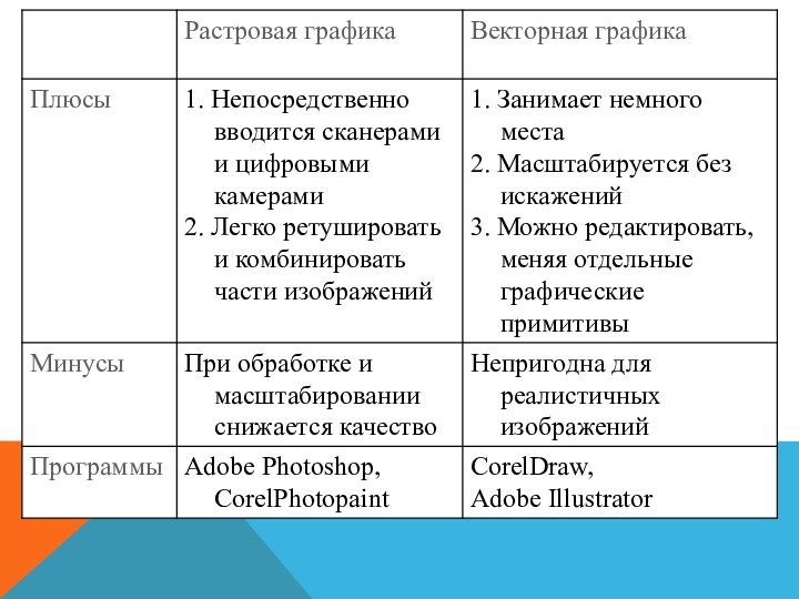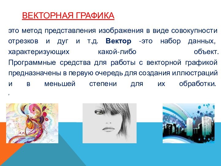 данных, характеризующих какой-либо объект. Программные средства для работы с векторной графикой предназначены в первую очередь для создания иллюстраций и в меньшей степени для их обработки. ,