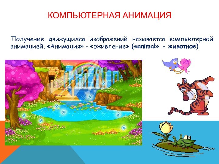 КОМПЬЮТЕРНАЯ АНИМАЦИЯПолучение движущихся изображений называется компьютерной анимацией. «Анимация» - «оживление» («animal» - животное)
