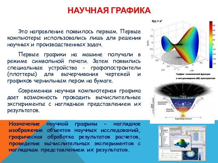 Назначение научной графики - наглядное изображение объектов научных исследований, графическая обработка результатов расчетов, проведение вычислительных экспериментов с наглядным представлением их результатов.
