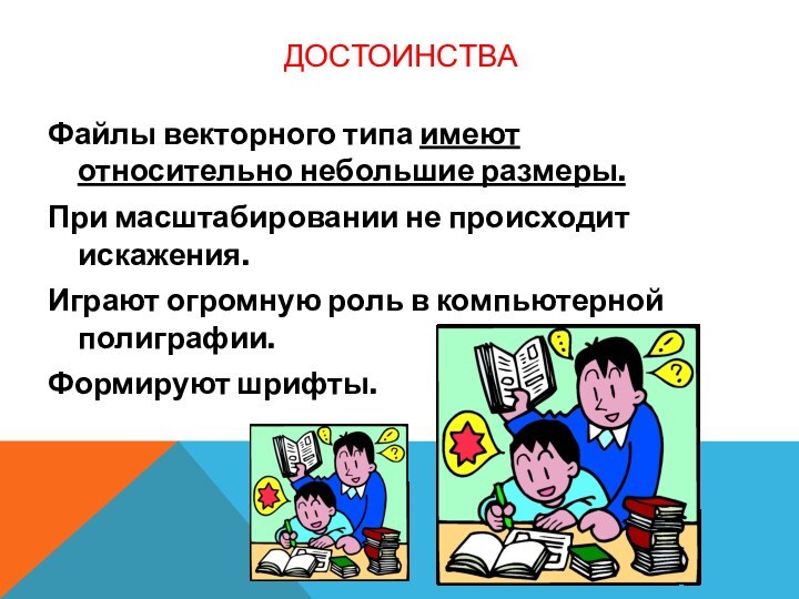 ДОСТОИНСТВАФайлы векторного типа имеют относительно небольшие размеры.При масштабировании не происходит искажения.Играют