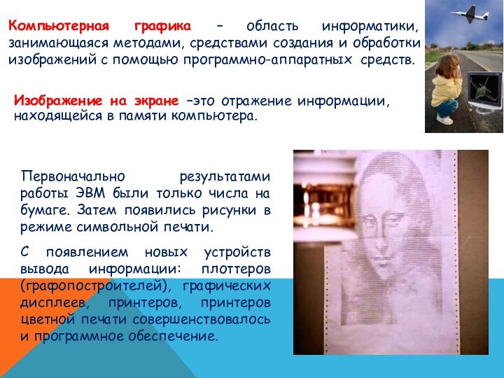 Первоначально результатами работы ЭВМ были только числа на бумаге. Затем появились рисунки в режиме символьной печати. С появлением новых устройств вывода информации: плоттеров (графопостроителей), графических дисплеев, принтеров, принтеров цветной печати совершенствовалось и программное обеспечение.Изображение на экране