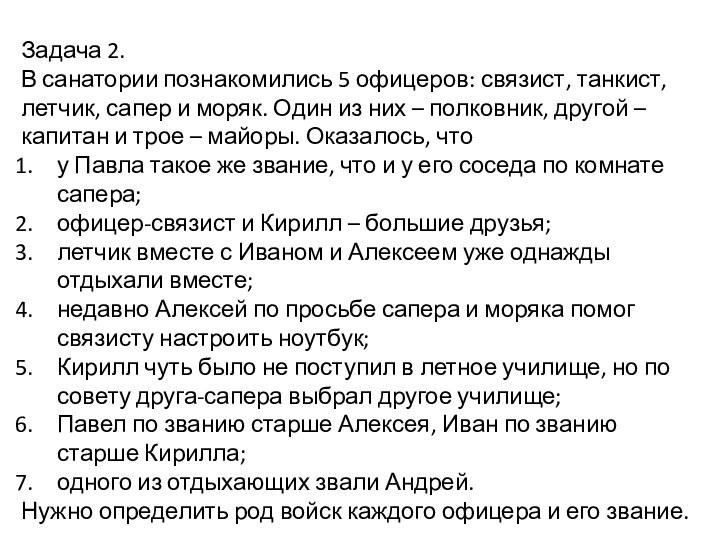 Задача 2.В санатории познакомились 5 офицеров: связист, танкист, летчик, сапер и