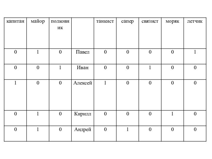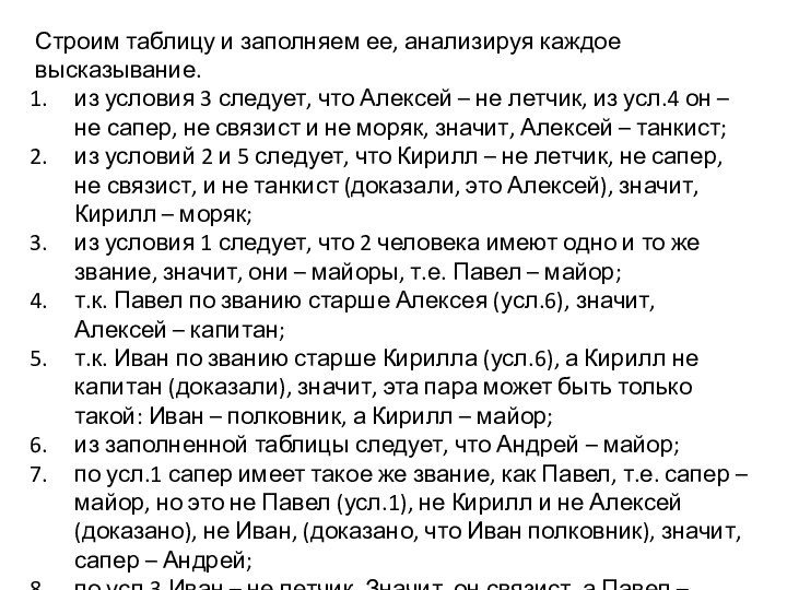 по усл.1 сапер имеет такое же звание, как Павел, т.е. сапер – майор, но это не Павел (усл.1), не Кирилл и не Алексей (доказано), не Иван, (доказано, что Иван полковник), значит, сапер – Андрей;