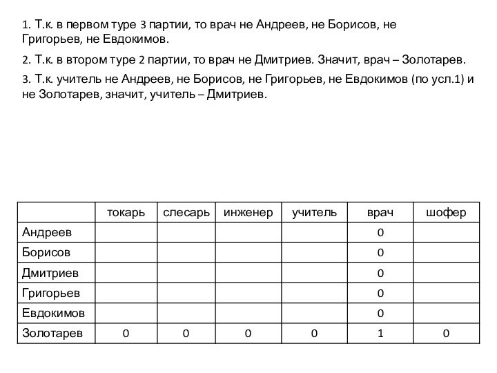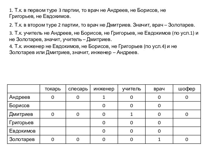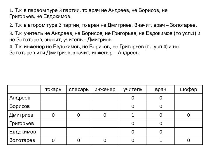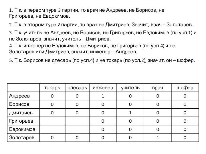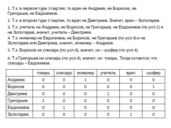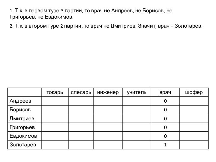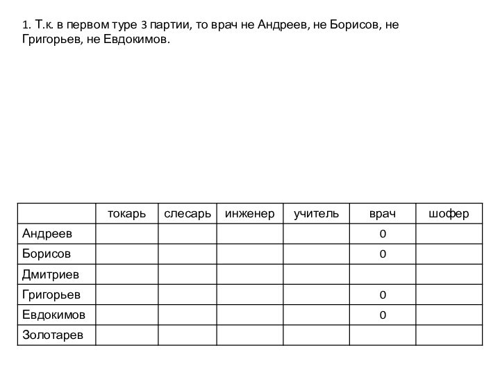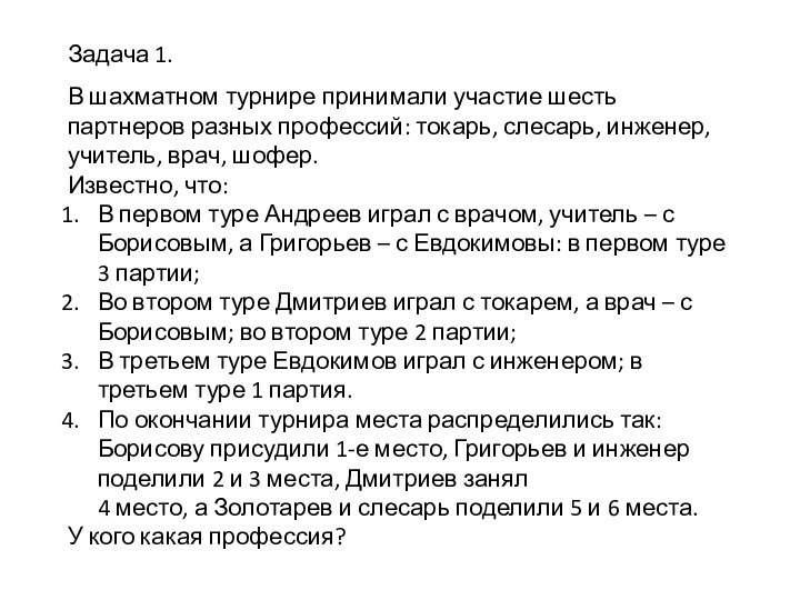 Задача 1.В шахматном турнире принимали участие шесть партнеров разных профессий: токарь, слесарь, инженер, учитель, врач, шофер.Известно, что:В первом туре Андреев играл с врачом, учитель – с Борисовым, а Григорьев – с Евдокимовы: в первом туре 3