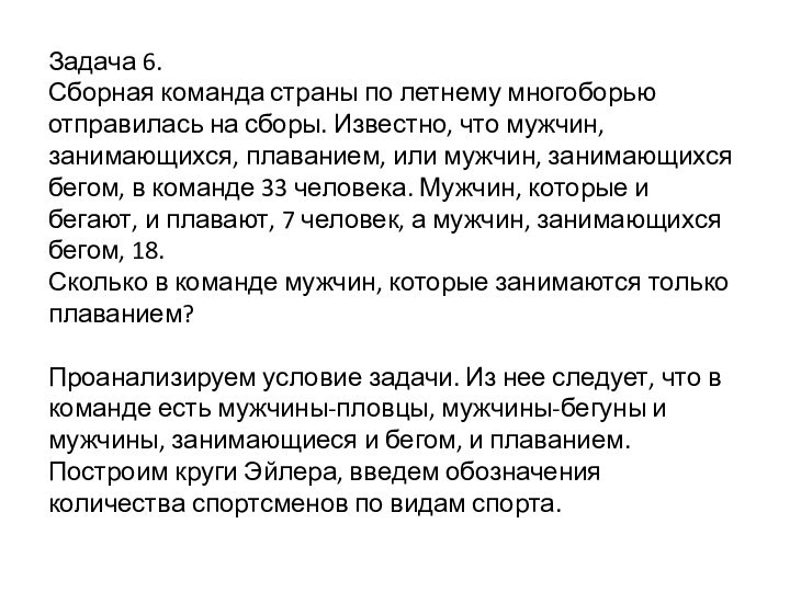 Проанализируем условие задачи. Из нее следует, что в команде есть мужчины-пловцы, мужчины-бегуны и мужчины, занимающиеся и бегом, и плаванием.