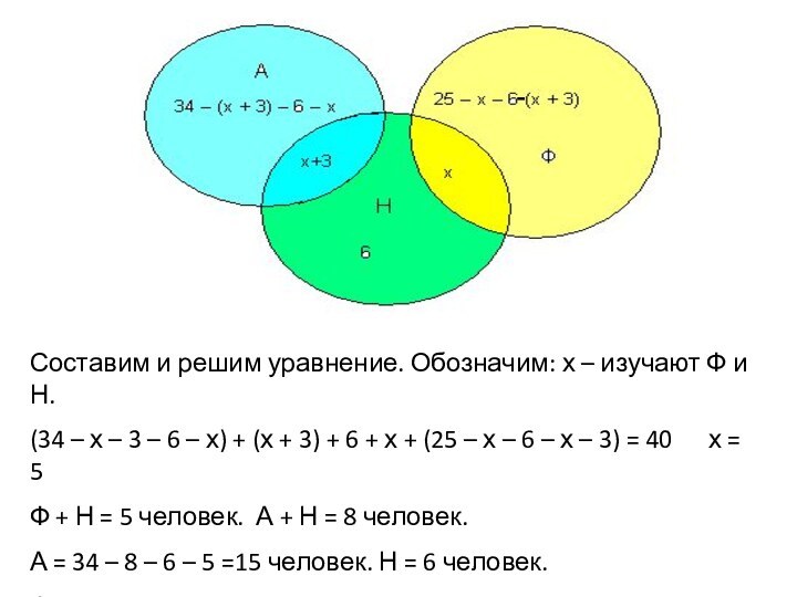 -Составим и решим уравнение. Обозначим: х – изучают Ф и Н. (34