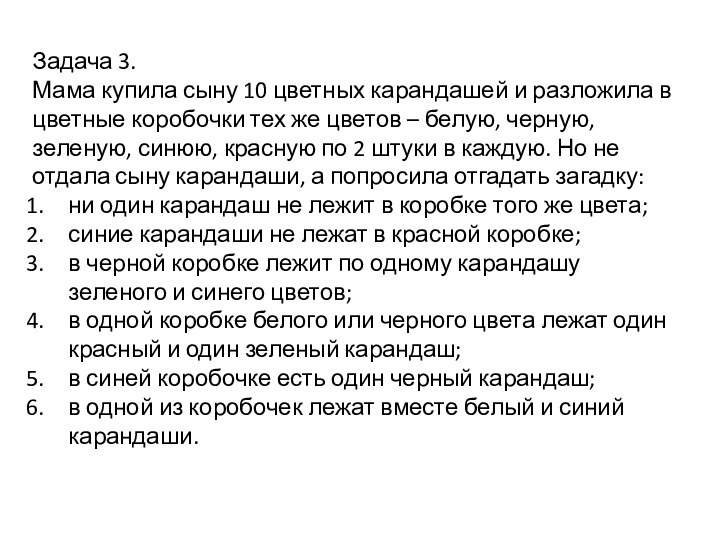Задача 3.Мама купила сыну 10 цветных карандашей и разложила в цветные