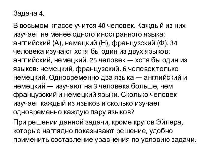 При решении данной задачи, кроме кругов Эйлера, которые наглядно показывают решение, удобно применить составление уравнения по условию задачи.