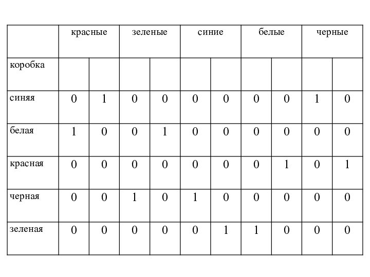 по таблице определяем, в какой коробке могут лежать вместе белый и синий карандаши;
