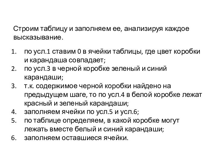 т.к. содержимое черной коробки найдено на предыдущем шаге, то по усл.4 в белой коробке лежат красный и зеленый карандаши;