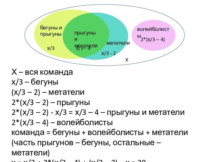 Х – вся командах/3 – бегуны(х/3 – 2) – метатели2*(х/3 –