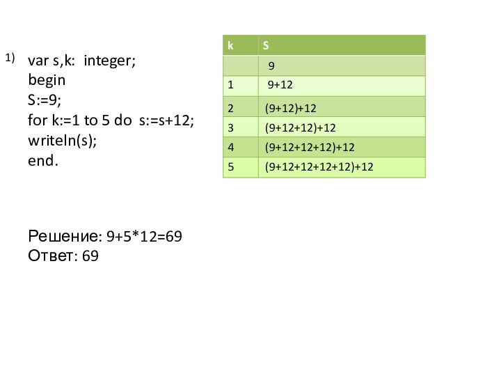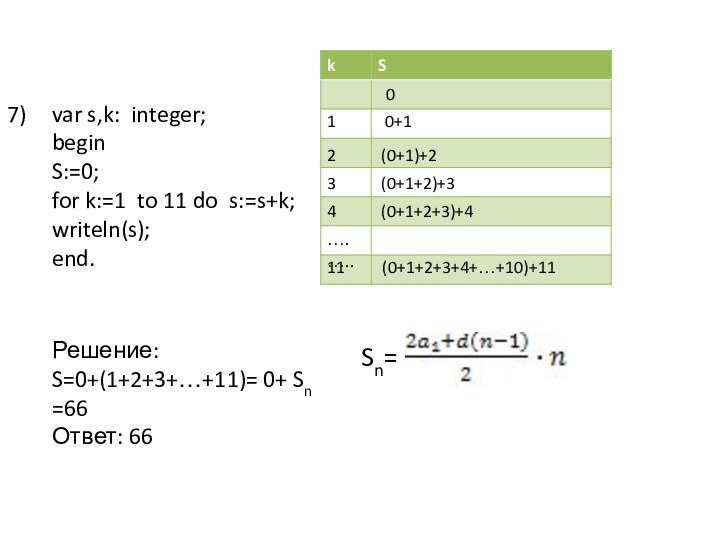 Решение: S=0+(1+2+3+…+11)= 0+ Sn =66