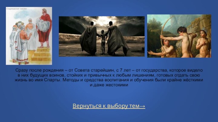 видело в них будущих воинов, стойких и привычных к любым лишениям, готовых отдать свою жизнь во имя Спарты. Методы и средства воспитания и обучения были крайне жёсткими и даже жестокими