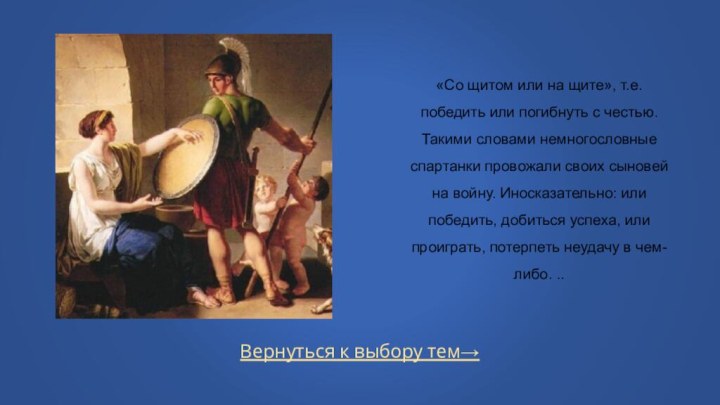 спартанки провожали своих сыновей на войну. Иносказательно: или победить, добиться успеха, или проиграть, потерпеть неудачу в чем-либо. ..
