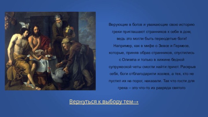 ведь это могли быть переодетые боги! Например, как в мифе о Зевсе и Гермесе, которые, приняв образ странников, спустились с Олимпа и только в хижине бедной супружеской четы смогли найти приют. Раскрыв себя, боги отблагодарили хозяев, а тех, кто не пустил их на порог, наказали. Так что гости для грека – это что-то из разряда святого