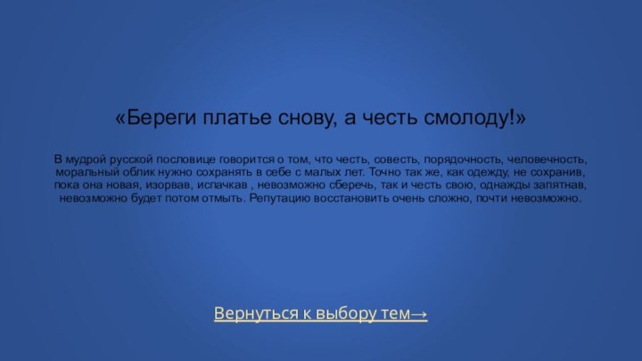 честь, совесть, порядочность, человечность, моральный облик нужно сохранять в себе с малых лет. Точно так же, как одежду, не сохранив, пока она новая, изорвав, испачкав , невозможно сберечь, так и честь свою, однажды запятнав, невозможно будет потом отмыть. Репутацию восстановить очень сложно, почти невозможно.