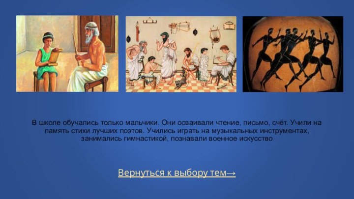 лучших поэтов. Учились играть на музыкальных инструментах, занимались гимнастикой, познавали военное искусство