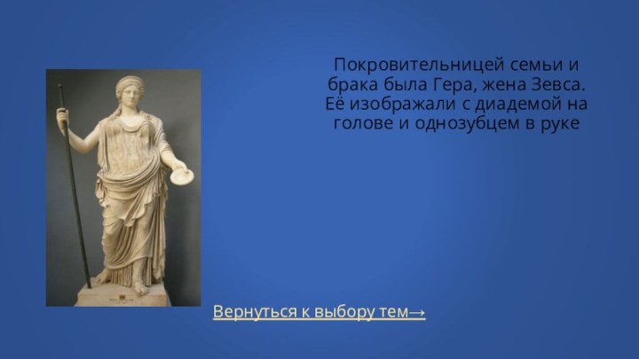 Покровительницей семьи и брака была Гера, жена Зевса.