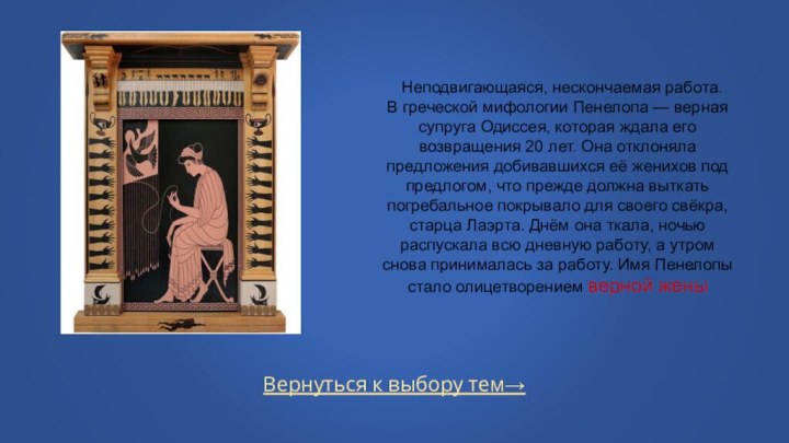 мифологии Пенелопа — верная супруга Одиссея, которая ждала его
