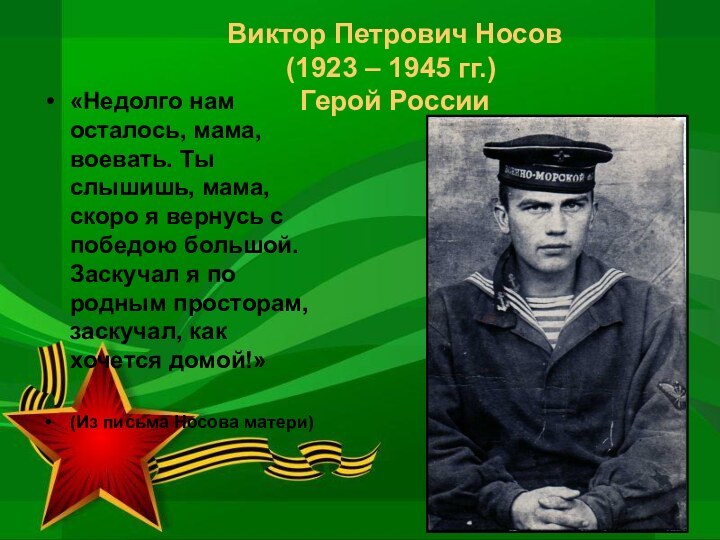 Виктор Петрович Носов (1923 – 1945 гг.) Герой России«Недолго нам осталось, мама, воевать. Ты слышишь, мама, скоро я вернусь с победою