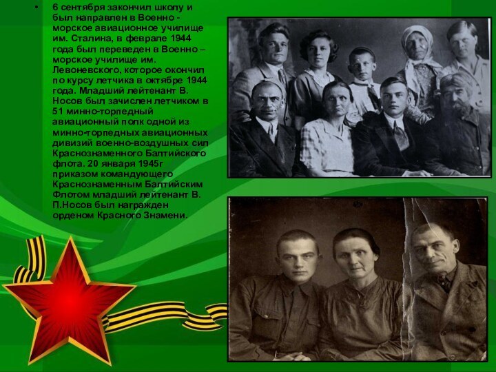 1944 года был переведен в Военно – морское училище им. Левоневского, которое окончил по курсу летчика в октябре 1944 года. Младший лейтенант В.Носов был зачислен летчиком в 51 минно-торпедный авиационный полк одной из минно-торпедных авиационных дивизий военно-воздушных сил Краснознаменного Балтийского флота. 20 января 1945г приказом командующего Краснознаменным Балтийским Флотом младший лейтенант В.П.Носов был награжден орденом Красного Знамени.