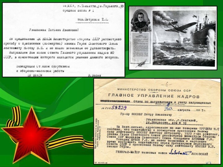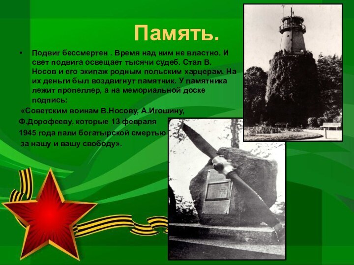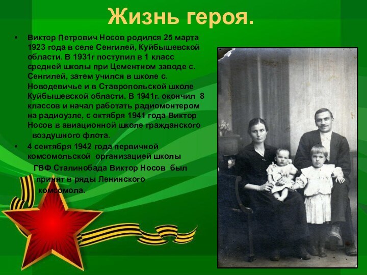 Герои Советского Союза и РоссииСенгилеевского районаСенгилеевский районный краеведческий музей им.А.И.СолуяноваPrezentacii.com Виктор Петрович Носов Жизнь героя.Виктор Петрович Носов родился 25 марта 1923 года в селе Сенгилей, 6 сентября закончил школу и был направлен в Военно - морское авиационное Шел февраль 1945 года. Советские войска, взломав сильно укрепленную позицию противника на Бомбардировщик под командованием младшего лейтенанта В. Носова вместе с другими самолетами из Память.Подвиг бессмертен . Время над ним не властно. И свет подвига освещает 30 июня 1965 года на средства собранные молодежью в Сенгилее был открыт Почетное звание.      23 февраля 1998 года