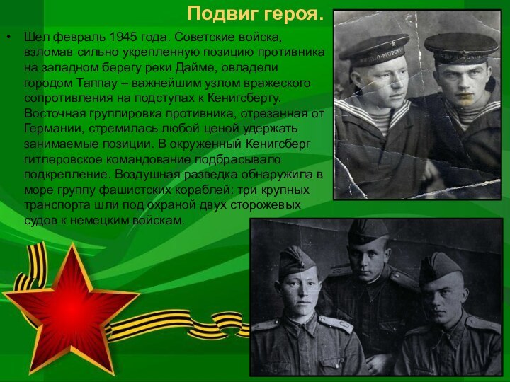 городом Таппау – важнейшим узлом вражеского сопротивления на подступах к Кенигсбергу. Восточная группировка противника, отрезанная от Германии, стремилась любой ценой удержать занимаемые позиции. В окруженный Кенигсберг гитлеровское командование подбрасывало подкрепление. Воздушная разведка обнаружила в море группу фашистских кораблей: три крупных транспорта шли под охраной двух сторожевых судов к немецким войскам.
