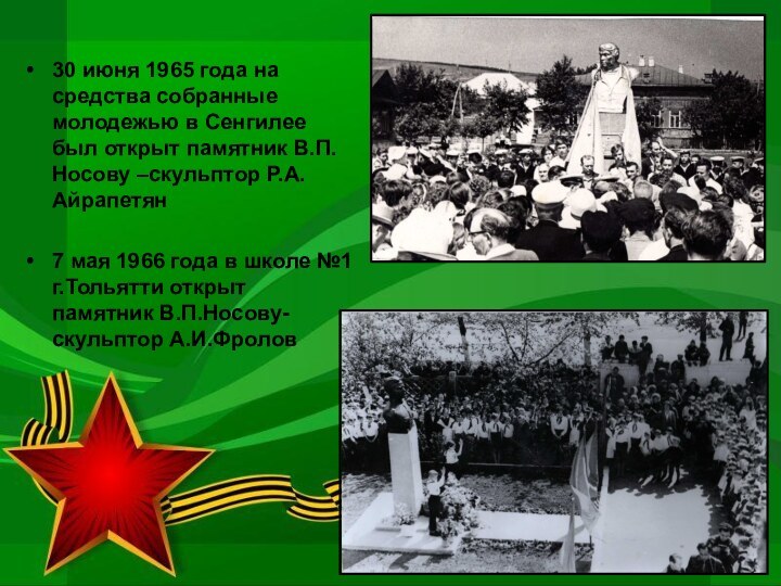 мая 1966 года в школе №1 г.Тольятти открыт памятник В.П.Носову- скульптор А.И.Фролов