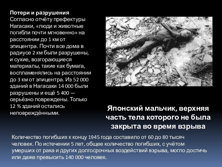 Количество погибших от взрыва составило от 70 до 80 тысяч человек. К концу 1945 года, в связи с действием радиоактивного заражения и других пост-эффектов взрыва, общее количество погибших составило от 90 до 166 тысяч человек. По истечении 5 лет, общее количество погибших, с учётом умерших от рака и других долгосрочных воздействий взрыва, могло достичь или даже превысить 200 000 человек.