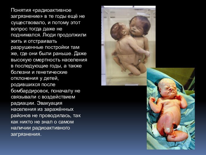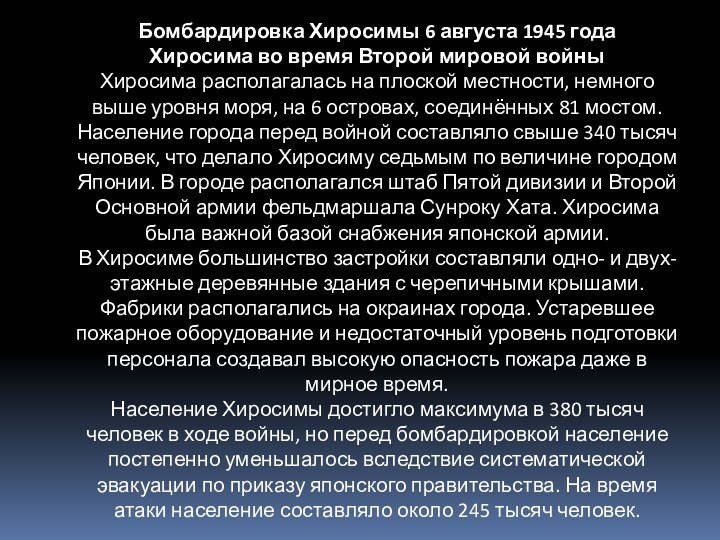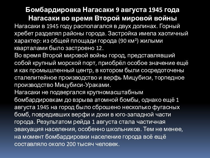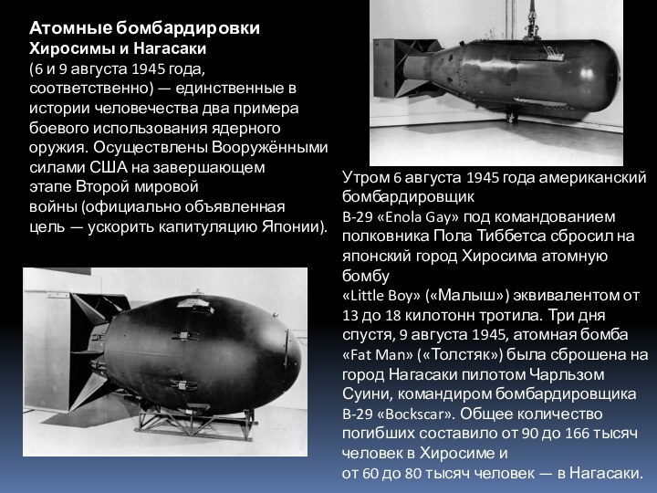 (6 и 9 августа 1945 года, соответственно) — единственные в истории человечества два примера боевого использования ядерного оружия. Осуществлены Вооружёнными силами США на завершающем этапе Второй мировой войны (официально объявленная цель — ускорить капитуляцию Японии).