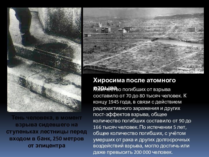 Количество погибших к концу 1945 года составило от 60 до 80 тысяч человек. По истечении 5 лет, общее количество погибших, с учётом умерших от рака и других долгосрочных воздействий взрыва, могло достичь или даже превысить 140 000 человек.