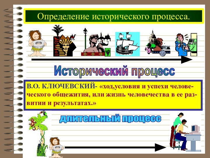 Определение исторического процесса. Исторический процессВ.О. КЛЮЧЕВСКИЙ- «ход,условия и успехи челове-ческого общежития, или жизнь человечества в ее раз-витии и результатах.»
