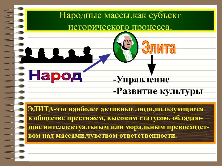 Народные массы,как субъект исторического процесса. -Управление -Развитие культуры ЭЛИТА-это наиболее