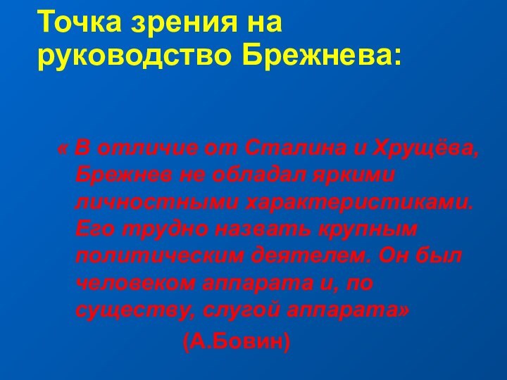 Сталина и Хрущёва, Брежнев не обладал яркими личностными характеристиками.