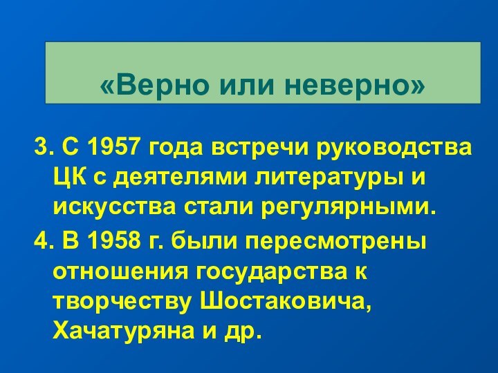 были пересмотрены отношения государства к творчеству Шостаковича, Хачатуряна и др.