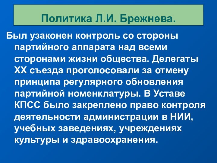 отмену принципа регулярного обновления партийной номенклатуры. В Уставе КПСС было закреплено право контроля деятельности администрации в НИИ, учебных заведениях, учреждениях культуры и здравоохранения.
