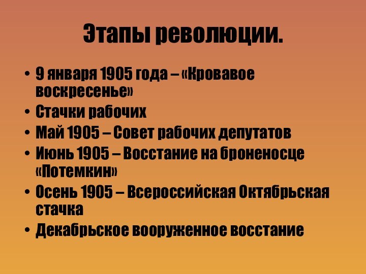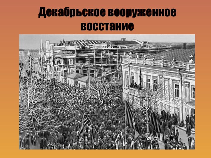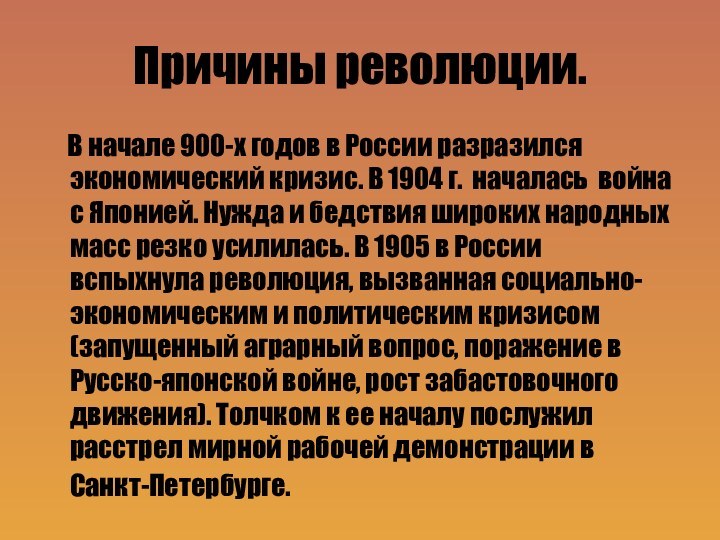 началась война с Японией. Нужда и бедствия широких народных масс резко усилилась. В 1905 в России вспыхнула революция, вызванная социально-экономическим и политическим кризисом (запущенный аграрный вопрос, поражение в Русско-японской войне, рост забастовочного движения). Толчком к ее началу послужил расстрел мирной рабочей демонстрации в Санкт-Петербурге.