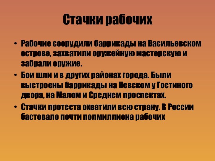 районах города. Были выстроены баррикады на Невском у Гостиного двора, на Малом и Среднем проспектах.