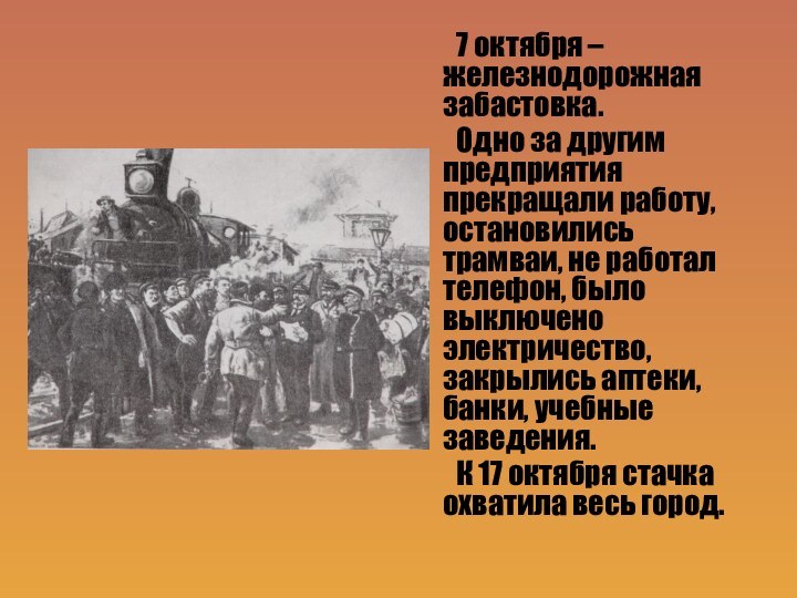 Бастующие требовали ввести 8-часовой рабочий день, установить минимум заработной платы, улучшить условия труда, созыва Учредительного собрания.