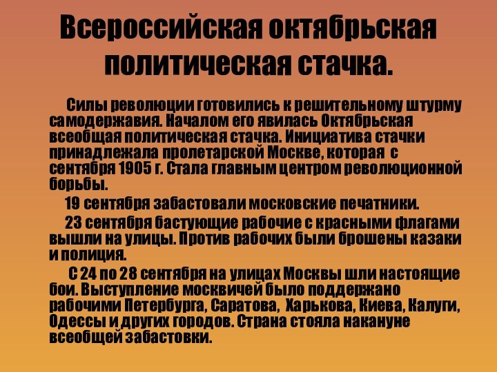 самодержавия. Началом его явилась Октябрьская всеобщая политическая стачка. Инициатива стачки принадлежала пролетарской Москве, которая с сентября 1905 г. Стала главным центром революционной борьбы.