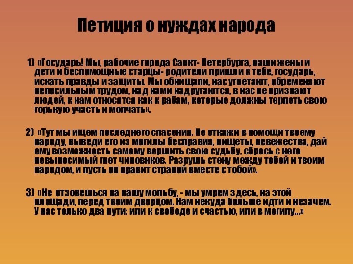 2) «Тут мы ищем последнего спасения. Не откажи в помощи твоему народу, выведи его из могилы бесправия, нищеты, невежества, дай ему возможность самому вершить свою судьбу, сбрось с него невыносимый гнет чиновнков. Разрушь стену между тобой и твоим народом, и пусть он правит страной вместе с тобой».