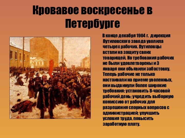 рабочих. Путиловцы встали на защиту своих товарищей. Но требования рабочих не были удовлетворены и 3 января они обьявили забастовку. Теперь рабочие не только настаивали на приеме уволенных, они выдвинули более широкие требовния: установить 8-часовой рабочий день; учредить выборную комиссию от рабочих для разрешения спорных вопросов с администрацией; улучшить условия труда, повысить заработную плату.