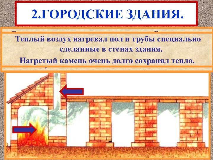 Теплый воздух нагревал пол и трубы специально сделанные в стенах здания.