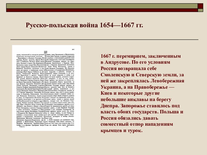 1667 г. перемирием, заключенным в Андрусове. По его условиям Россия возвращала