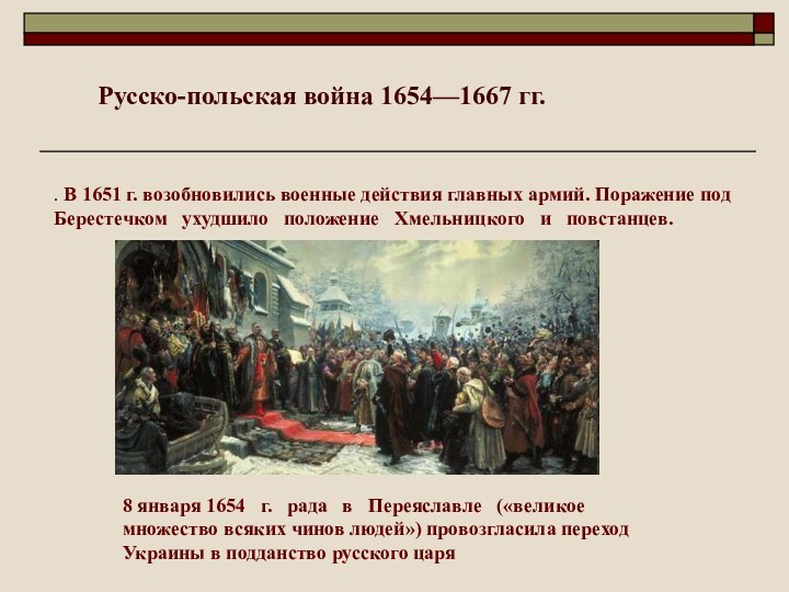 8 января 1654 г. рада в Переяславле («великое множество всяких чинов людей») провозгласила переход Украины в подданство русского царя