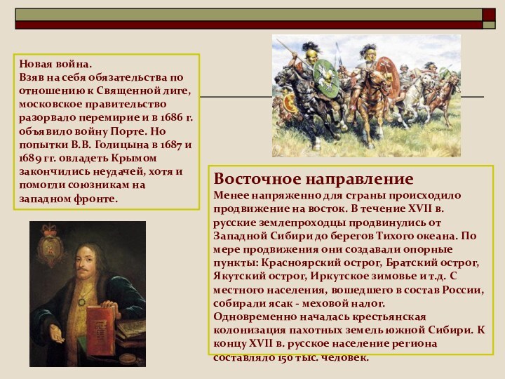 1686 г. объявило войну Порте. Но попытки В.В. Голицына в 1687 и 1689 гг. овладеть Крымом закончились неудачей, хотя и помогли союзникам на западном фронте.