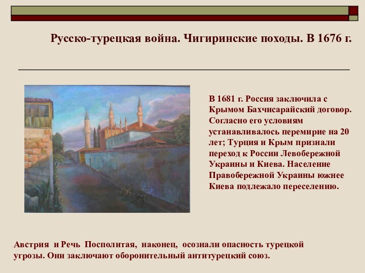 В 1681 г. Россия заключила с Крымом Бахчисарайский договор. Согласно его