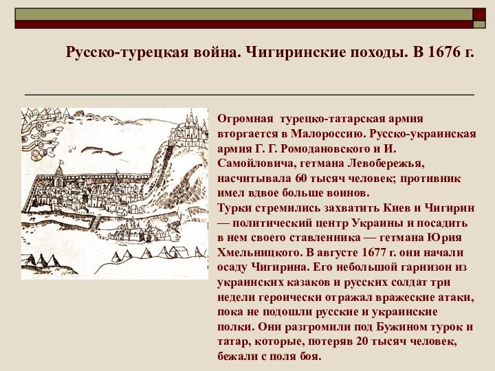 Русско-турецкая война. Чигиринские походы. В 1676 г.Огромная турецко-татарская армия вторгается в