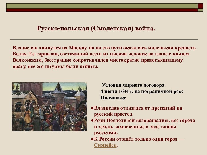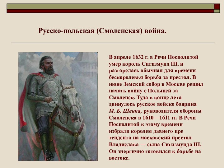 для времени бескоролевья борьба за престол. В июне Земский собор в Москве решил начать войну с Полыней за Смоленск. Туда в конце лета двинулось русское войско боярина М. Б. Шеина, руководителя обороны Смоленска в 1610—1611 гг. В Речи Посполитой к этому времени избрали королем давнего пре­тендента на московский престол Владислава — сына Сигизмунда III. Он энергично готовился к борьбе на востоке.